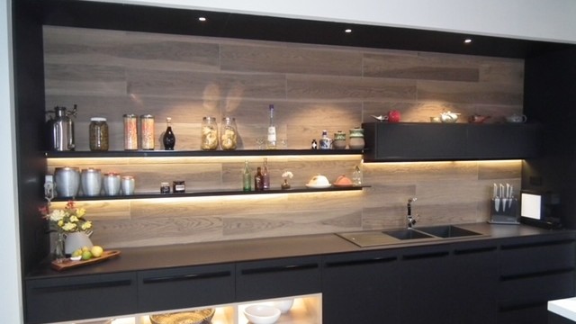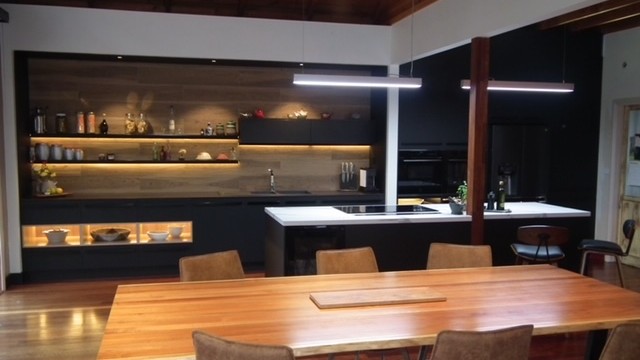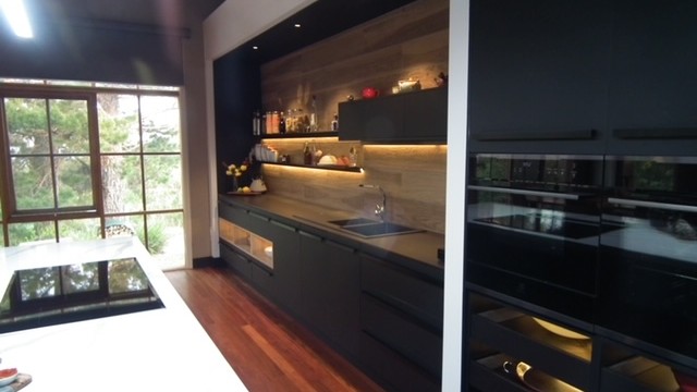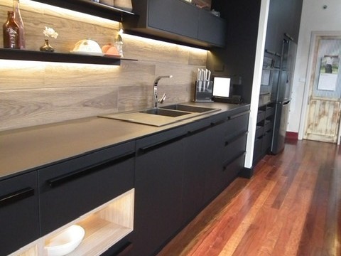 Using Abey Schock Onyx under-mount sink below Fenix 12mm Nero Ingo compact laminated benchtop for a Matt anti-fingerprint finish.